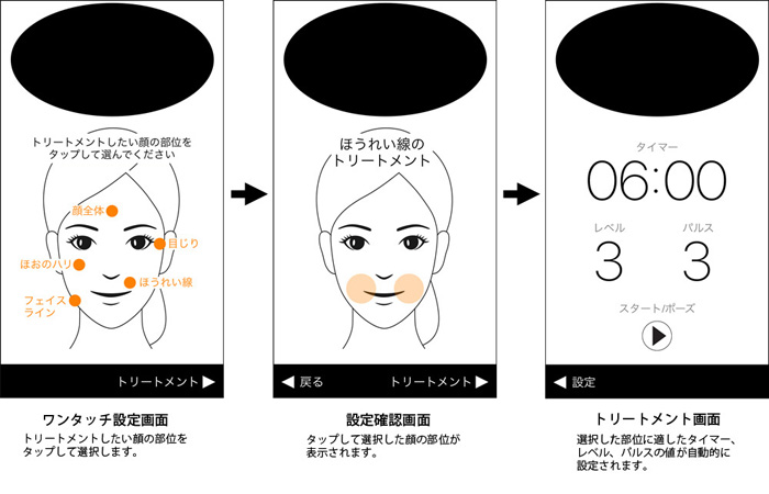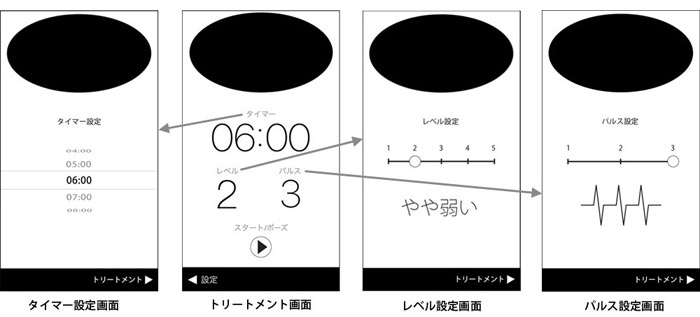 アプリの画面をタップするだけのワンタッチ設定もできますが、トリートメントの時間、電流のレベル、パルスのタイミングなどを個別に設定することも可能で、自分に最も合った設定を作りパーソナライズすることもできます。 スマートフォンの画面を使った設定は見やすく簡単で、他のアプリのように誰でもすぐに使いこなせます。